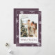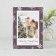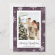 Purple snowflake photo Christmas card featuring snowflakes on a snowy purple background. Easily personalise this photo Christmas card with your photo and family name.