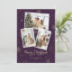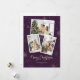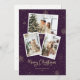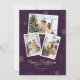 Custom purple and gold photo Merry Christmas card featuring a photo collage, an elegant script font and purple background adorned with falling snow and snowflakes. Easily personalise this modern holiday card with your photos and text.