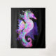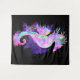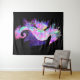 an abstract and very colorful purple artwork of a seahorse on a black piece of wall tapestry