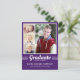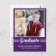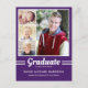 This sports-inspired graduation announcement postcard features a 4-photo layout and fun athletic design. On the front, choose four of your favourite photos for the template -- three smaller photos and one large vertical photo. Below the photos, the word "Graduate" is written in sporty script and framed by white stripes against a purple background. Add the graduate's name, graduation year, and school to the bottom. On the back of the graduation postcard, you can write a custom message to recipients and include grad party details.