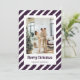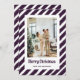 Purple photo Merry Christmas card featuring little stars against a purple and white striped pattern. Easily personalise this festive holiday card with your photo and a family name.