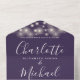 All in one wedding invitation featuring pretty string lights, elegant signature script name and monogram initials on a purple background. The invitation includes a perforated RSVP card that can be individually addressed or left blank for you to handwrite your guest's address details. Designed by Thisisnotme©