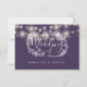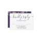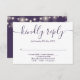 A stylish RSVP card with your details set in chic typography and personalised with your names, hand-drawn floral foliage, and string lights on a purple background on the reverse. Designed by Thisisnotme©