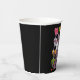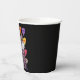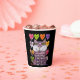 These paper cups are black with a cute purple cat with stripes and bright green eyes sitting in front of a wall of colourful candy hearts with love sayings.