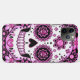 Dia de los Muertos sugar skull in colourful hues of purple surrounded by flowers.