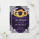 Purple and sunflower wedding save the date card featuring sunflowers and delicate floral lace against a rustic wood background.