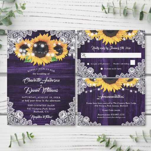 Purple Sunflower Wood Lace String Lights Wedding Invitation
