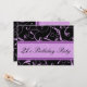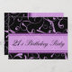Invitations for a girl's 21st birthday party with elegant purple and black floral swirly design, stylish and pretty, fully customisable with your party details.