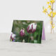 Are these variegated tulips white with purple or purple with white? Whichever, I wish they were in my garden! This photo shows a close up of a mature blossom with a shorter one still in bud to the left against a blurred, green-mottled background. At the left corner, part of another tulip shows, with a bit of bluebell behind it. On the right is a bit of green stalk of another tulip out of our sight, with the curl of a leaf at the lower right, and the tip of another bud in the centre bottom of the image. In the upper left corner are the words, "For You, Mum" in white script. Inside is a quote by Anthony Brandt: "Other things may change us, but we start and end with family." Copyright Gail Storrs 2008.