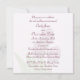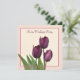 A photo of three rich deep burgundy purple tulips on a cream background with a border in two shades of a pale and deeper pink. The text is in a matching purple formal script, with all the celebration party details on the reverse to fill in. On the basic white stock which may be easily changed.