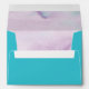 Turquoise and purple blue Dendrobium orchid flower wedding envelope (printed return address on the back flap) with lilac purple and turquoise watercolor background on the inside of the envelope and turquoise colour on outside. This type of orchid is violet purple and teal or turquoise blue in colour and is called a blue Dendrobium orchid. There are also other shades of purple and blue or turquoise in this flower. This particular orchid flower is very affordable and is often used in peacock wedding themes.