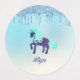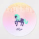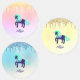 This design features a teal and muted purple unicorn, almost like a fanciful pony on a carousel, with faux silver glitter dripping onto three different pastel coloured backgrounds. The background colours are gradient, and include mostly yellow, mostly pink, and mostly blue. Type your child's name in the Personalised section, and it will appear in muted purple.