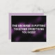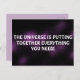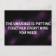 This is a beautiful 'purple Universe' design postcard with a powerful quote that says: 'THE UNIVERSE IS PUTTING TOGETHER EVERYTHING YOU NEED!' written in big white letters.