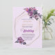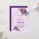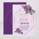 A beautiful watercolor purple and violet floral bouquet is embellished with deep violet black buds and leaves at the top of a gold hexagon double frame on the front of this wedding invitation. A second, smaller bouquet is located at the bottom left of the frame. Your custom text is in violet black, gold, and matching purple inside the frame. A subtle faux gold glitter swirl is placed over the center, and everything is placed on a pale lavender background. The back of the invitation is solid matching purple, with the same glitter swirl at the center. Very elegant for spring, summer, or autumn weddings.