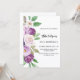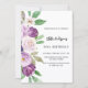 A violet, lavender watercolored background and an arch frame. Decorated with violet and purple watercolored flowers and greenery. Personalise and add your name and party details.