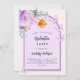 A blush pink background with a purple and violet coloured arch. Decorated with a floral, rose flower, green watercolored eucalyptus greenery and butterflies. Personalise and add a name and party details.