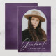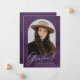 Elegant graduation announcement featuring the graduate's photo inside of an arch frame with a purple watercolor background. "Graduate" is displayed in a white modern calligraphy script with the graduate's name, school, and grad year shown below. The photo graduation announcement reverses to display a matching purple watercolor background with space for additional text and photos.