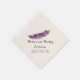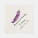 Wedding napkins featuring a watercolor inspired illustration of a purple feather. Personalise the text with names and date.