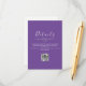 Minimalist, elegant, modern, purple wedding details card with QR code for more information, silver rope heart and simple calligraphy script.