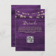 Boho, elegant, gold string lights on rustic wood purple wedding details card with QR code for more information.