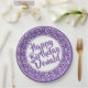 This over-the-hill design has a purple and white random number pattern with a white milestone number 65 repeated in varied sizes and angles. There is a white circle in the centre for your text and purple and white rings around the rim.