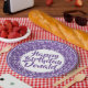 This over-the-hill design has a purple and white random number pattern with a white milestone number 85 repeated in varied sizes and angles over a purple background. There is a white circle in the centre for your text and purple and white rings around the rim.