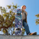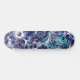 Dd brand skateboard, with graphic artwork of a white, lavender and blue floral design, on a dark purple background. Customise to add your own text.