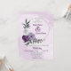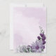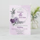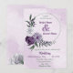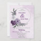 Beautiful botanical wedding invitation featuring purple lavender and white flowers with green leaves on a green circle forming a pretty romantic wreath.