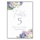 This romantic floral wedding table card features watercolor purple and white hydrangeas. A delicate bouquet of hydrangea flowers is pictured on the top, and another on the bottom.