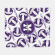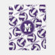 This volleyball themed fleece blanket features a mirrored pattern of volleyballs with purple and white panels and the sporty font text "I love volleyball" in purple that stretches between the angled rows of volleyballs - athlete name and monogram can be personalised on the large overlying circle pendant - background is customisable white - easily delete the "I love volleyball" text lines, if desired, or replace the monogram with the player's varsity letter or jersey number - by katz_d_zynes