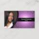 This card design front features a purple and white spiral number background with a photo placeholder on the left and template name and title on the right. The back includes a QR code, coordinated design and colours, and text fields for the business name and details. Replace the placeholder photo with your vertical format photograph and your link for the QR Code. Use the QR code to send potential customers to your website, referrals or another business orientated page. Fill in the template fields or edit using the design tool to select a font style, size, and colour you like. The placeholder photo is courtesy pixabay.com.