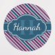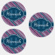 Stylish, trendy dark purple, white, teal blue tilted stripe pattern in the background, topped with a teal blue label featuring a customisable name and monogram template.