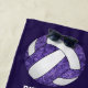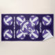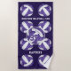This fun volleyball themed beach towel features a pattern of purple and white stylised volleyballs arranged in a mirrored pattern with customisable text between the volleyballs, currently team name & mascot name - the athlete's name and jersey number can be personalised, as well as the darker purple background - by katz_d_zynes