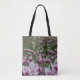 Over the shoulder tote bag with photograph of a field of purple & white tulips. Original photograph by Ray Bean.