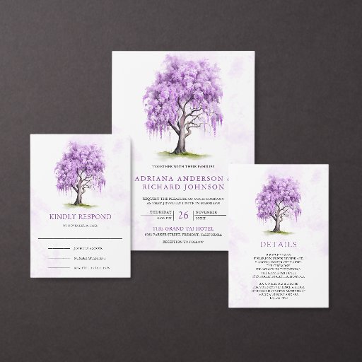 Elegant wedding RSVP card featuring a beautiful wisteria tree with purple flowers.
