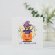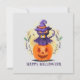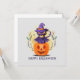 This charming Halloween greeting card features a purple witch cat wearing a pointed hat, playfully perched on top of a bright orange pumpkin. The festive phrase "Happy Halloween" ties it all together with spooky sweetness. Perfect for cat lovers, Halloween fans, and those who enjoy a cute twist on classic spooky season style.