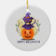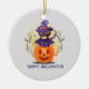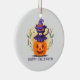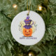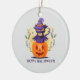 This charming Halloween ornament features a purple witch cat wearing a pointed hat, playfully perched on top of a bright orange pumpkin. The festive phrase "Happy Halloween" ties it all together with spooky sweetness. Perfect for cat lovers, Halloween fans, and those who enjoy a cute twist on classic spooky season style.
