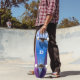 Dd brand skateboard, done in purple with a triangle of blue rays. Customise to add your own text.
