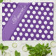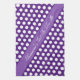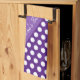Mauve and purple polka-dot patterned kitchen towel, accented with white. The dark purple background can be switched to any colour of your choice, or the pattern is removable. You may also personalise the text, or text is removable.