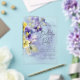 This simple but elegant acrylic birthday invitation design features a bouquet of purple, yellow, and lavender pansies and other flowers with greenery. The background is a purple watercolor splash on a textured white watercolor paper background. Created by Simply Farmhouse Press.