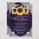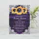Beautiful rustic purple and sunflower bridal shower invitations featuring sunflower flowers and white floral lace against rustic wood background. Matching items available.