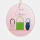 A cute ornament for a purse collector. A pink background featuring three purses in different styles and colours. Customise as desired.