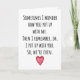 "Sometimes i wonder how you put up with me. Then I remember, oh, I put up with you. So, we're even." This funny card has a ring of truth, no matter who you are, and is perfect for your Anniversary or Valentine's Day, or any time at all!