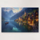 Puzzle with charming village lakeshore in Alps Mountains, fantasy illustration.