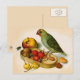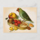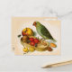 Bird art featuring an adorable Green Pygmy Parrot perched beside fruit and nuts. Fabulous animal still life available on gifts and apparel.