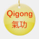 A female in an exercise pose on the front. The word Qigong in Chinese characters ( 氣功) and in English on the back. Qigong can also be written as chi kung or chi gong. The translation is "life energy cultivation". It is a discipline involving breath, movement and focus.