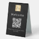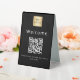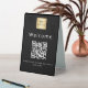 A classic black background, white coloured text. With the text: Welcome, and Please scant to view our menu and order. Personalise and add your business logo, QR code and text.
