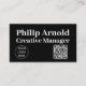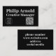A QR code is strategically positioned in the bottom corner, providing a seamless way to access your website, portfolio, or a custom landing page. The typography features a clean, modern sans-serif font, ensuring excellent readability against the dark background. The minimalist layout, with ample negative space, creates a polished and professional look. Optional finishes, such as spot gloss on the logo, matte lamination, or rounded corners, add an extra touch of refinement.