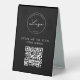 Professional modern minimalist QR code contactless black menu table tent sign. Custom black business template in a modern minimalist style which can be easily updated with your company logo, QR code and custom text.