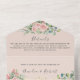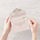 Elegant, modern, floral dusty pink all-in-one wedding invitation with gold rope heart, greenery, roses and custom picture of the couple at the back.